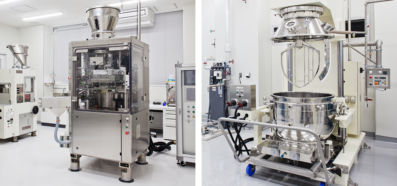 By the installation of new tablet-machine (Photo below left), the tableting level which has been done in-house since the beginning of the foundation, has improved both in quality・quantity. And as Void-Space Manufacturing Equipment (Photo below right) also has high-efficiency・Mass-capacity, the extracted substances of mycelia has improved tremendously.