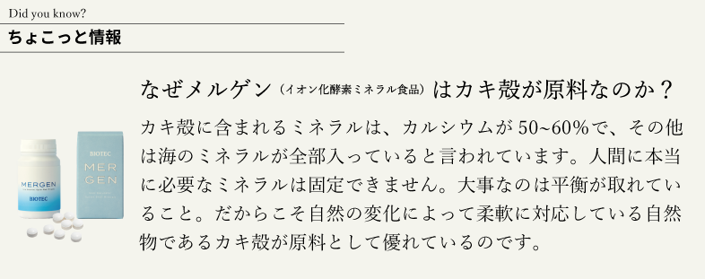 最後に、ミネラルお母さんは、鉄、亜鉛、銅、ヨウ素、セレンなど、さまざまな微量ミネラルを使って支えてくれています。微量ミネラルは料理の隠し味のようなものです。ほんの少しの量でも、酵素を助けたり、免疫を支えたり、ホルモンの働きを調整したり。これらを巧みに使い分けながら、私たちの健康を毎日そっと守っているのです。このお母さんを強化する、良質な「ミネラル」たっぷりの〝 メルゲン 〟とってもおススメです!